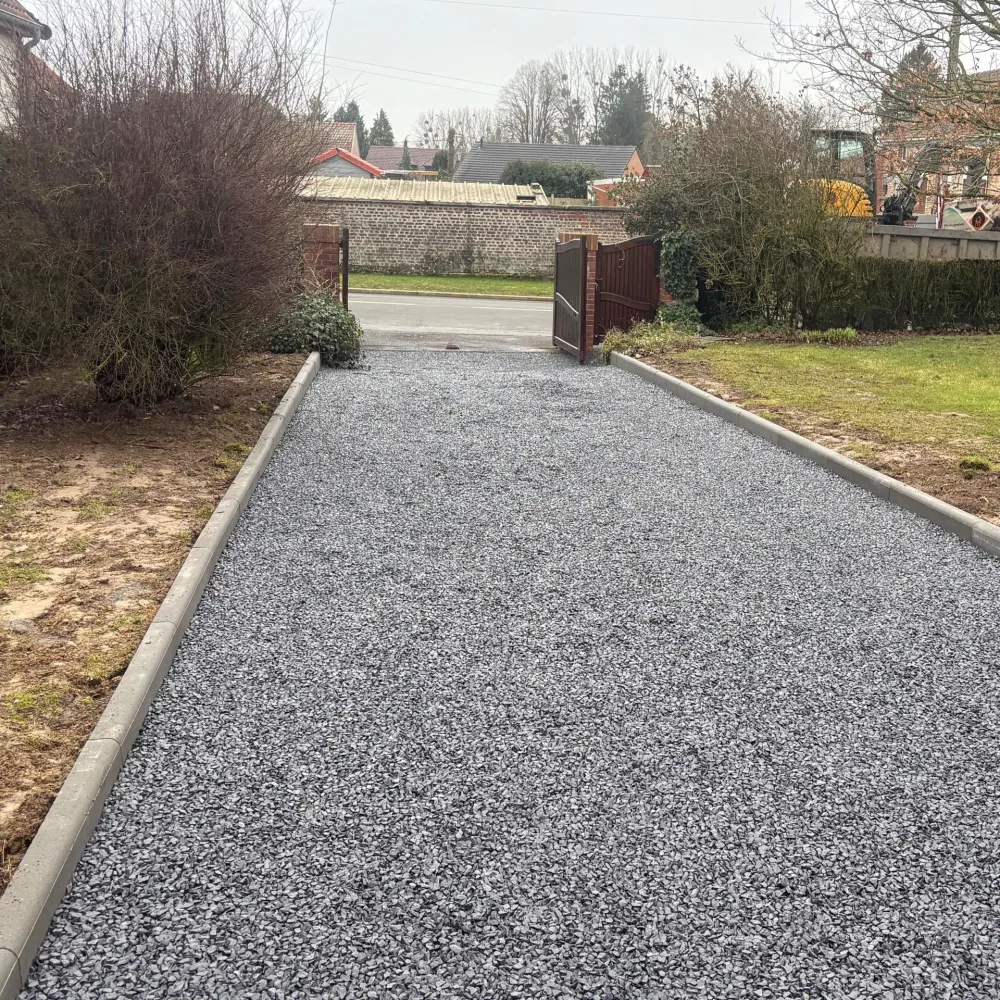 • Mise en place d’une grille stabilisatrice de gravier avec remplissage en gravier 10/14, pour un rendu à la fois esthétique et pratique.